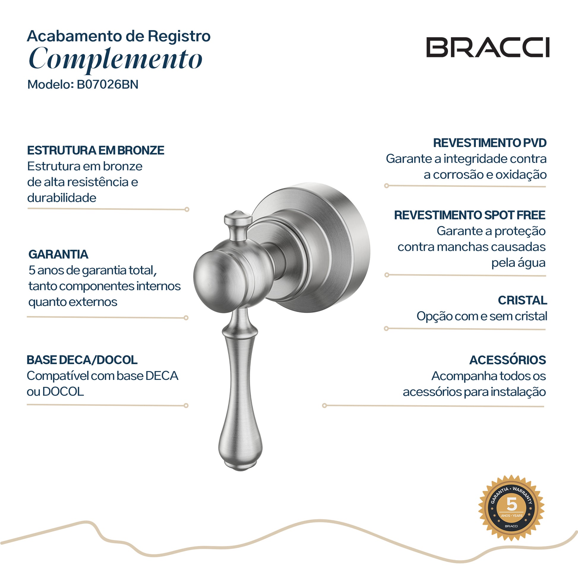 Para base DOCOL, é necessário selecionar o tipo da base (item adicional com custo no caso de DOCOL, disponível no campo de personalização antes de adicionar ao carrinho), para que possamos incluir a canopla extra necessária. Além disso, é necessário adquirir o conversor de registro DOCOL-DECA, que também está disponível para compra conosco.