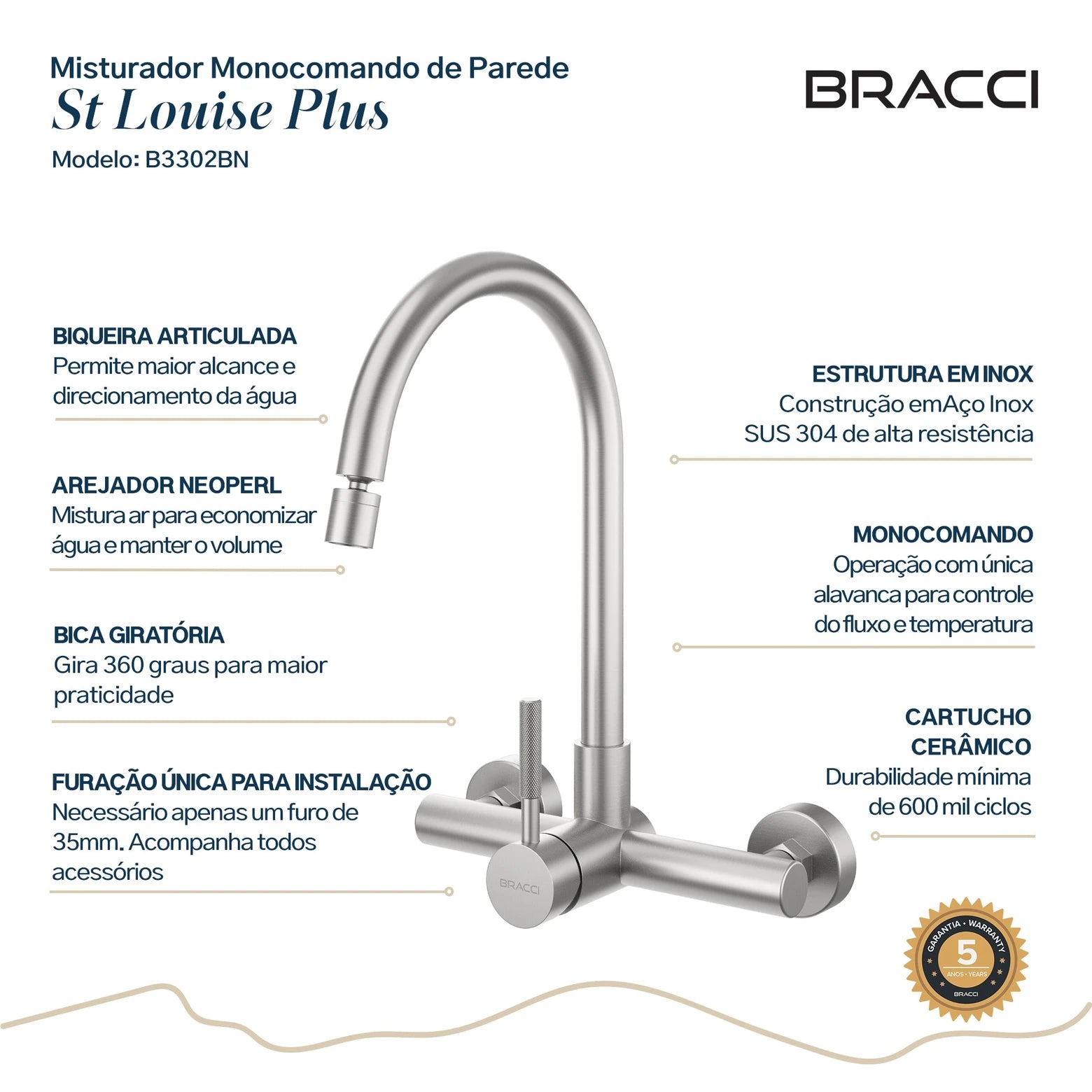 TORNEIRA MONOCOMANDO Q/F DE PAREDE ST LOUISE PLUS AÇO ESCOVADO