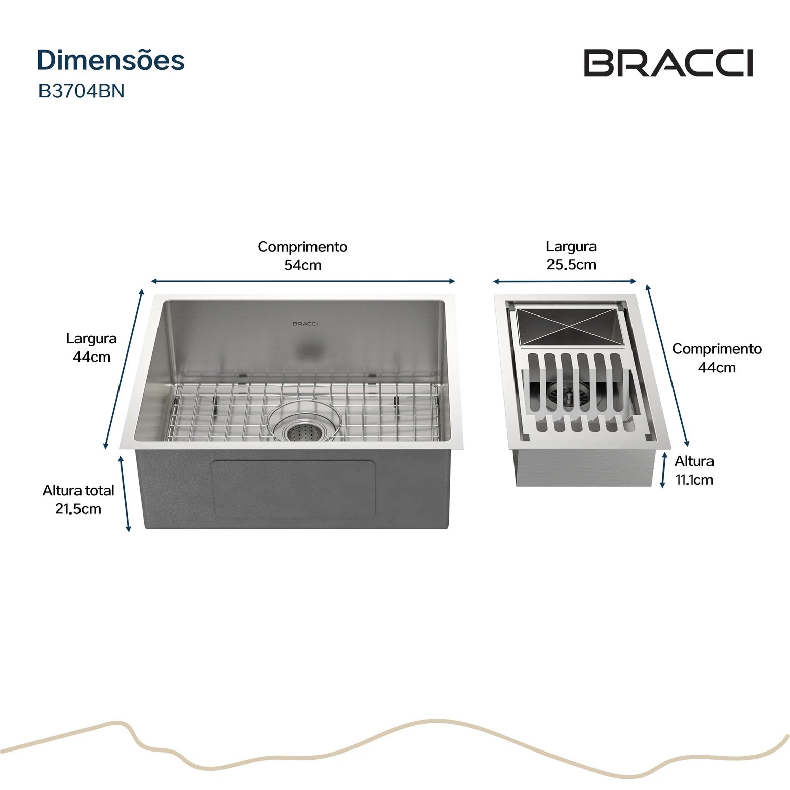 O Kit Cuba + Calha Organizadora Bracci combina a resistência e o design da Cuba de Cozinha 54 cm em Aço Inox 304 de 1,2 mm, com cantos arredondados, sistema de amortecimento de ruídos e instalação versátil, à praticidade da Calha Organizadora em Aço Escovado, que otimiza o espaço e mantém os utensílios sempre à mão. Juntos, oferecem funcionalidade, sofisticação e garantia de 5 anos Bracci para transformar sua cozinha.