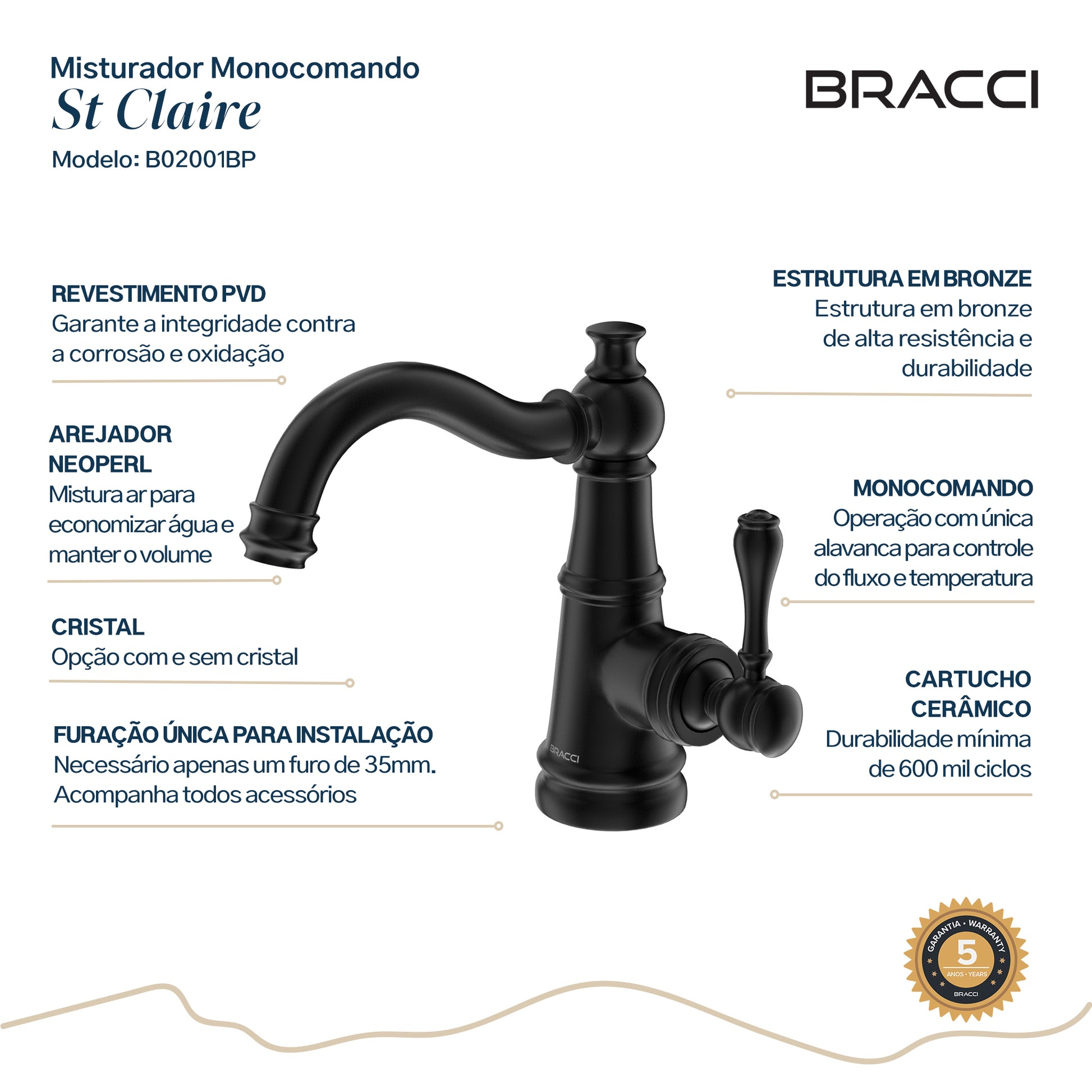TORNEIRA MONOCOMANDO Q/F ST CLAIRE PRETO PVD
