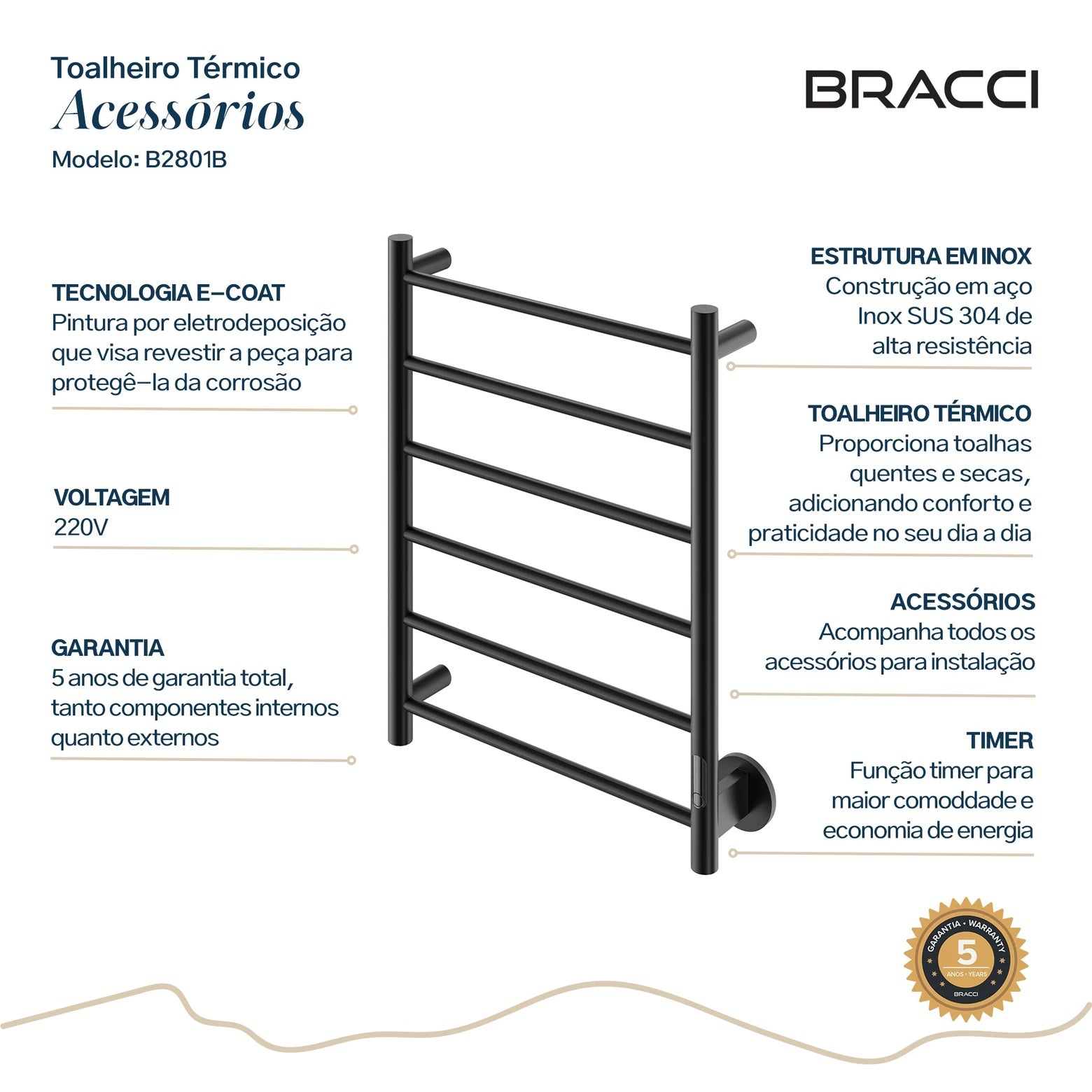Transforme a experiência do seu banho com o Toalheiro Térmico da Bracci, um item que alia funcionalidade e elegância ao seu banheiro. Mantendo suas toalhas sempre secas, quentes e prontas para uso, ele evita a proliferação de bactérias e mofo, garantindo um ambiente mais saudável.