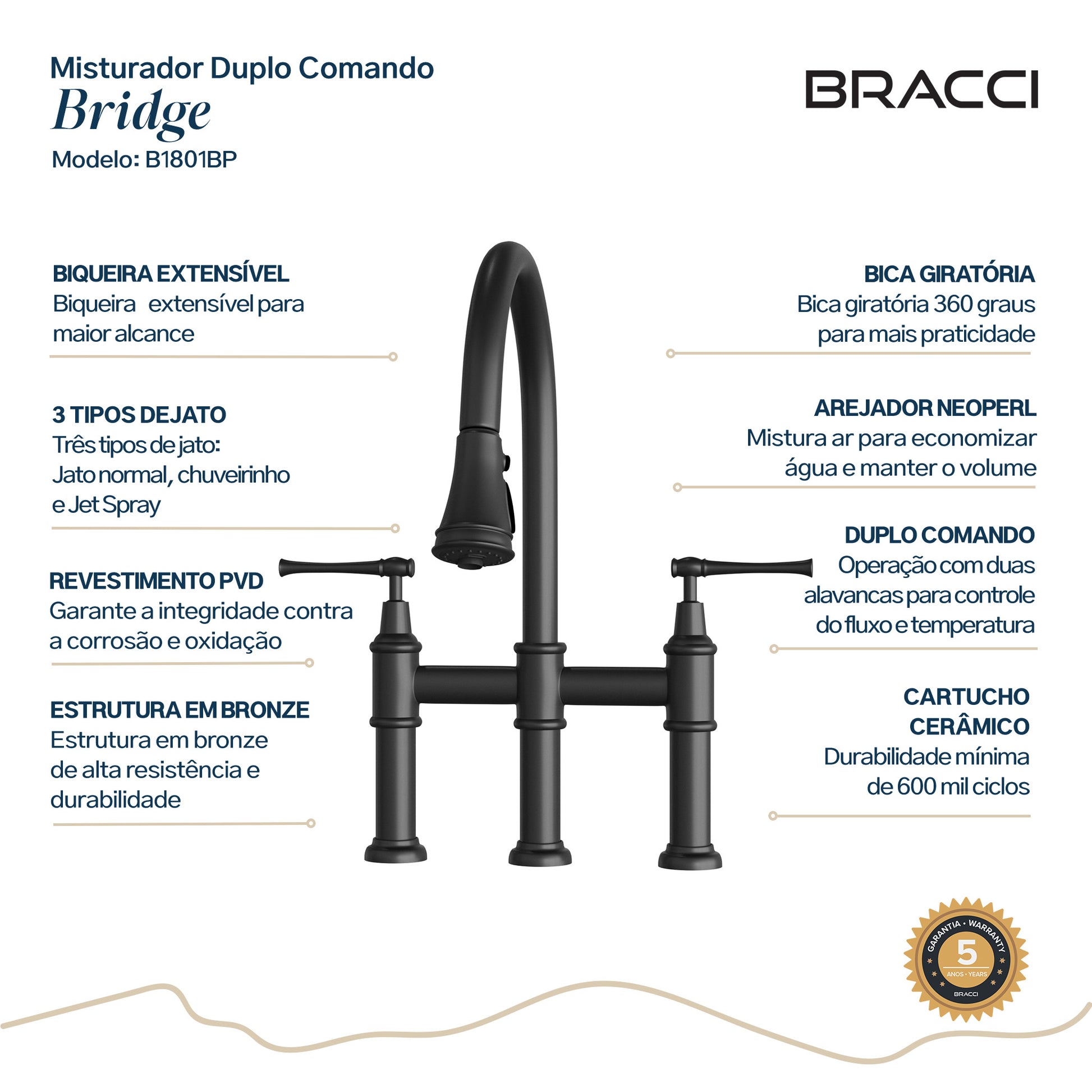 Atingindo o equilíbrio perfeito entre o estilo clássico e contemporâneo, as curvas e os detalhes decorativos desta torneira criam um visual imponente que complementa qualquer cozinha. Projetado para maior conveniência no dia a dia, possui bica extensível, permitindo que você alcance todos os cantos de sua cuba. Além disso, possui 3 tipos de jato, sendo um deles, o JET-SPRAY, que através de uma lâmina de água forte, limpa os resíduos de alimentos com o apertar de um botão. As construções em bronze sólido aliado aos melhores componentes da indústria garantem um desempenho excelente e duradouro.
